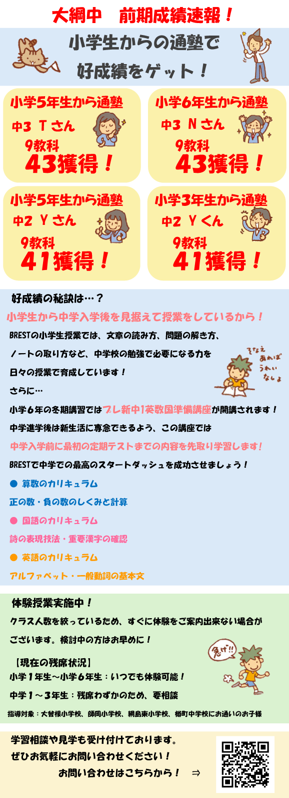 BREST大倉山 大綱中学校 2025年度前期 成績速報!!