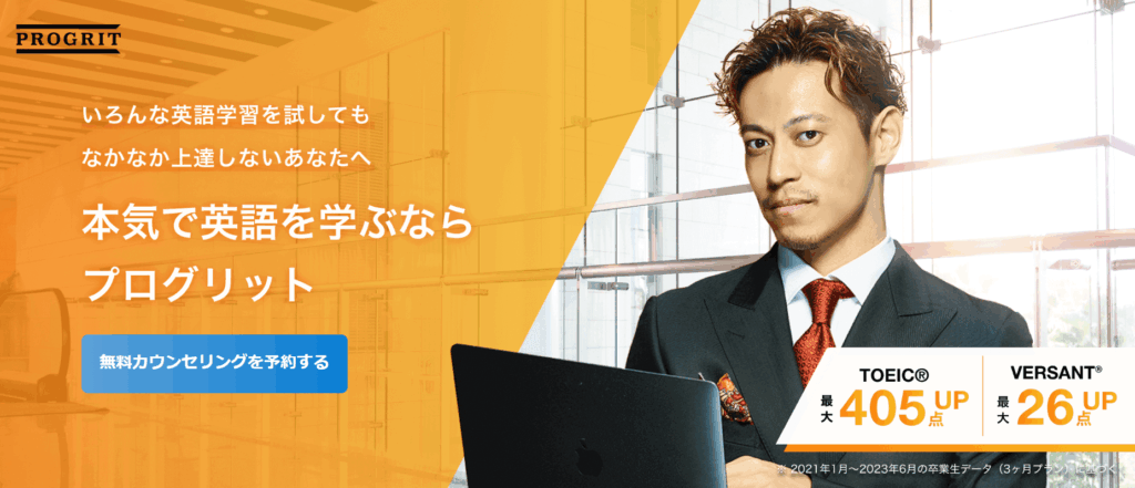 プログリット(PROGRIT)は、2〜6ヶ月という短期間で英語力を劇的に向上させることに特化した完全パーソナルトレーニング型の英会話コーチングスクールです。英語力だけでなく、学習を継続できる**「習慣化」**に重点を置いているのが大きな特徴です。